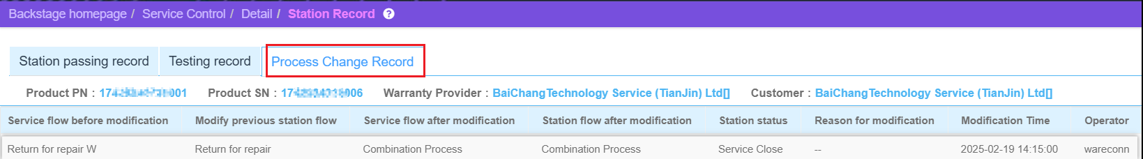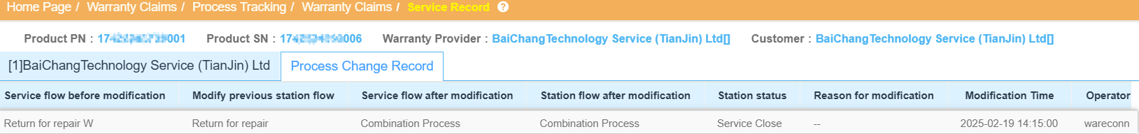 When a returned product arrives at the service center, users can modify the process based on actual conditions. The system supports both the application of previously set processes and changes to new service and workstation processes, allowing direct transitions to designated workstations. Users can also view process change records.