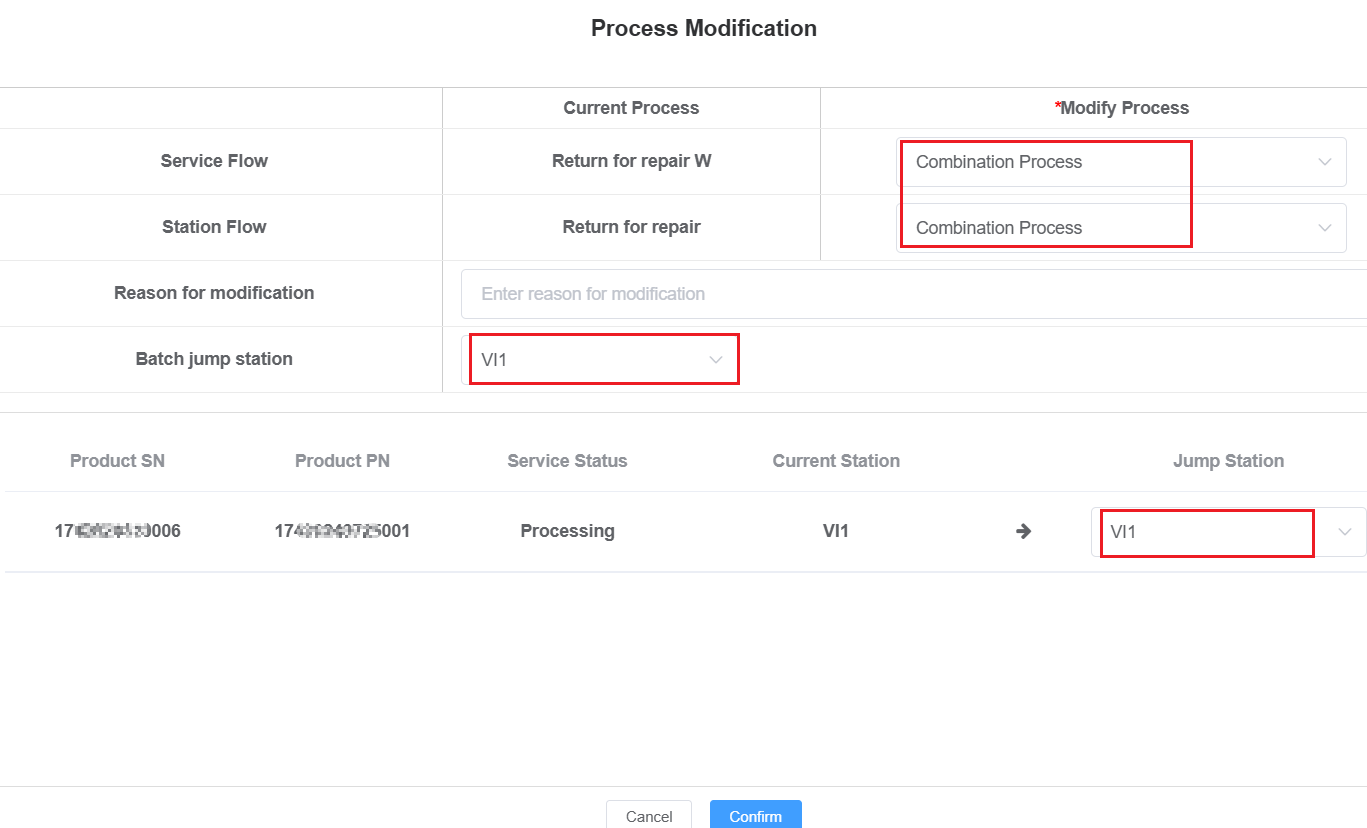 If process modifications are required per customer request, follow these steps: Service Center Portal → Progress Control → Progress Tracking → Process Modification, Modify the SN process and transition to the designated workstation.