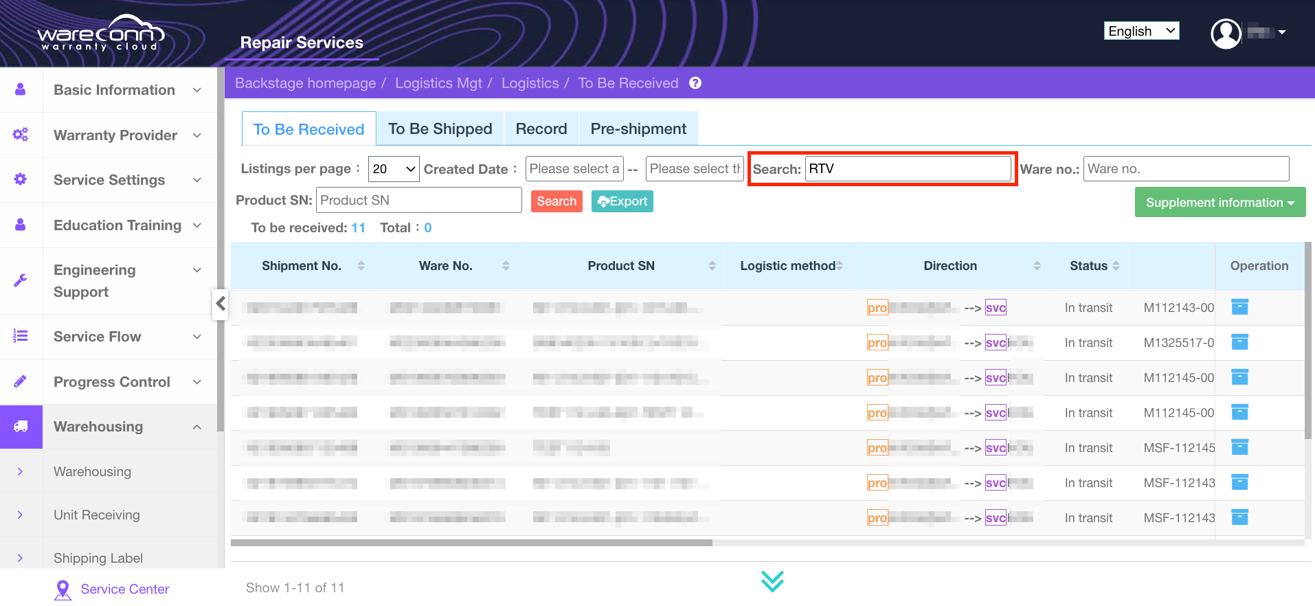 After the vendor returns the repaired products, service center can search for the corresponding order in “To Be Received.” Upon verification of product information, the products are received into the spare parts warehouse for subsequent customer warranty support.