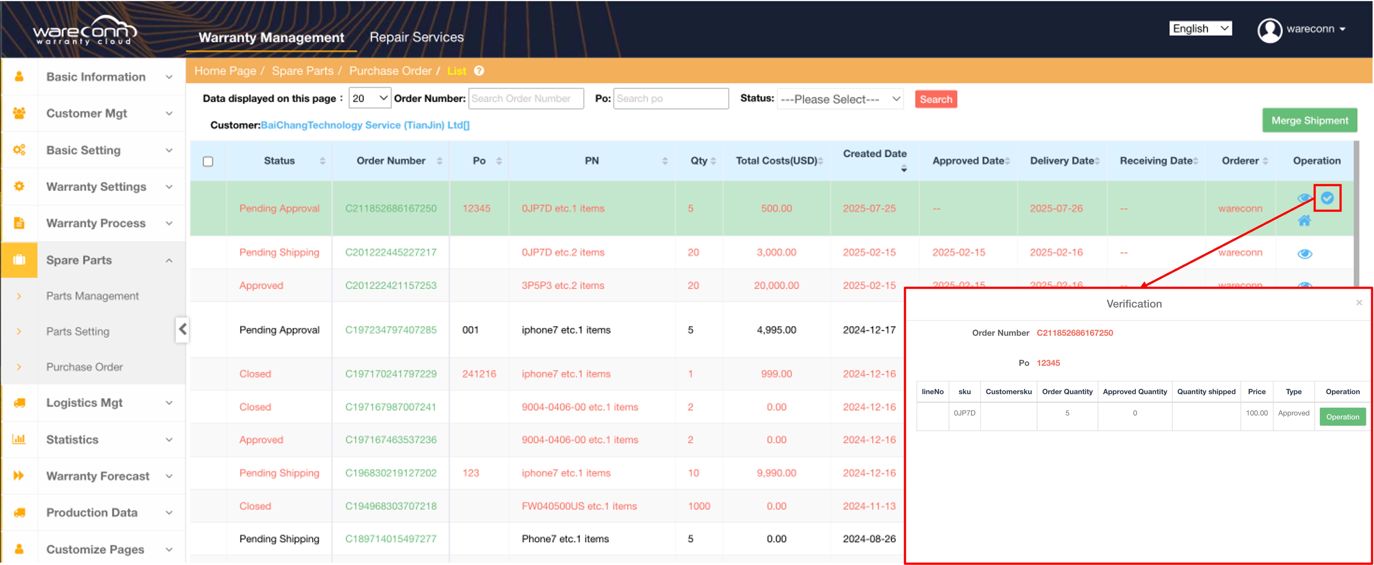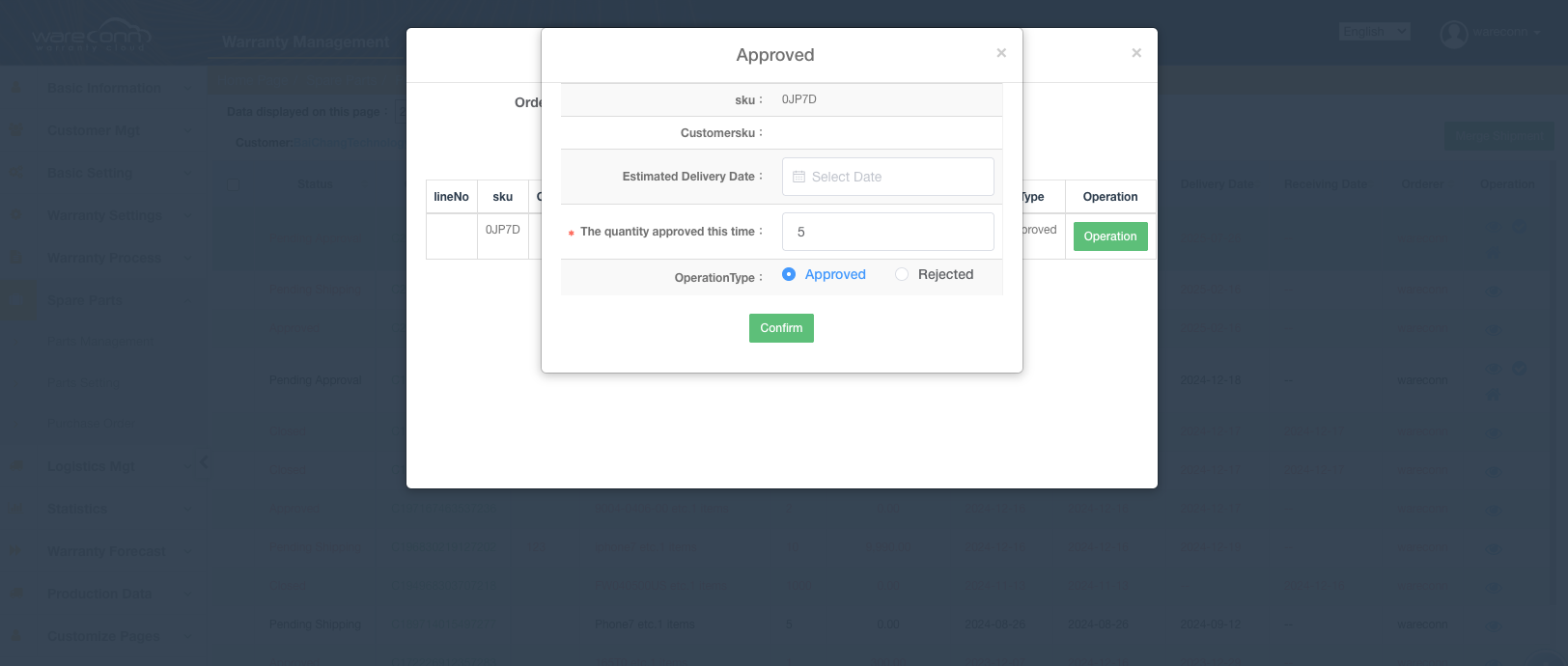On July 22, 2025, the Wareconn Warranty Cloud platform enhanced the Spare Parts Ordering feature by introducing a "Partial Approval & Shipment" capability. This allows users to schedule shipments more flexibly according to business needs, significantly improving the efficiency and accuracy of spare parts order processing.